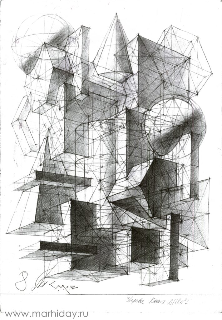 Creative drawing of a composition of given geometric bodies (cube, rectangular prism, pyramid, cone, cylinder, ball, etc.)