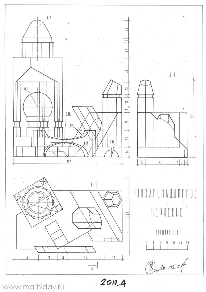 It is required to draw three orthogonal projections with a section according to a given axonometric image of a volumetric-spatial composition of geometric shapes (4 hours). The drawing is made with a pencil and then is stroked by ink.